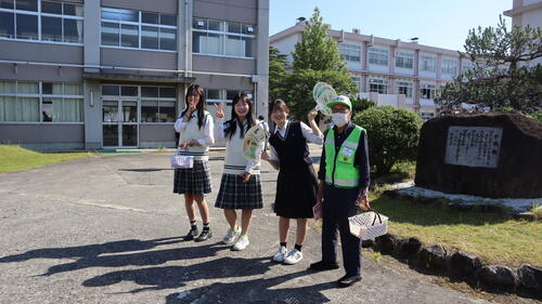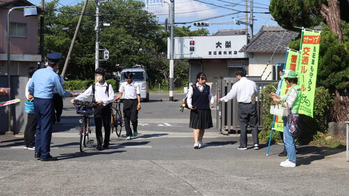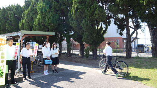 朝早くから、生徒会役員が登校する生徒にチラシやうちわを配布し、ヘルメット着用や交通ルール遵守の声かけを行いました。