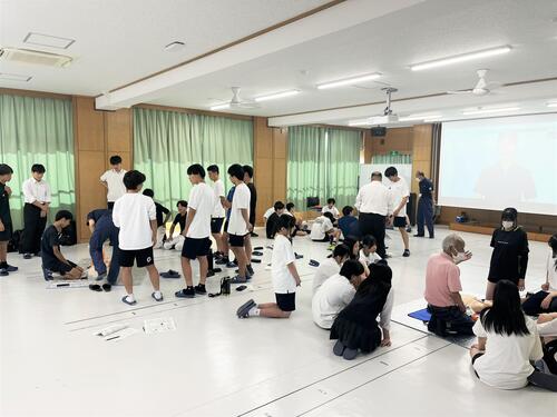 田辺高校からは運動部員を中心に生徒34名、教員2名の計36名が参加し、DVDの視聴後、班別に分かれて心臓マッサージやAED使用に伴う声かけ・指示を実践的に学びました。注意点も踏まえながら、本番を想定した経験ができました。