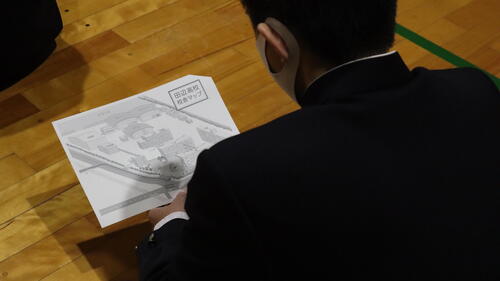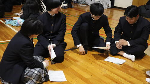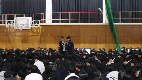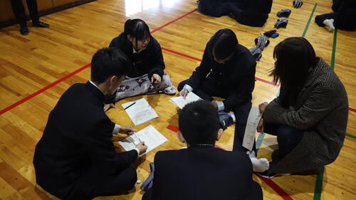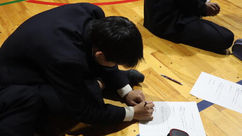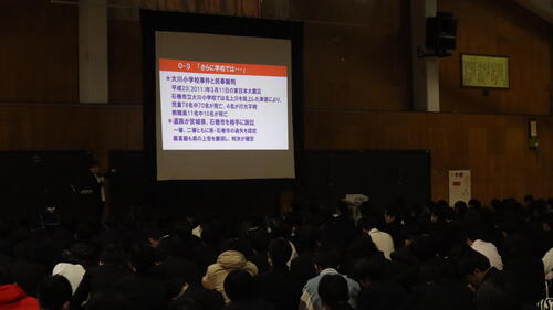 11月27日(水)、全学年対象の防災教育講演会を実施しました。特定非営利活動法人地方危機管理研究所の吉村 裕司様をお招きし、過去の地震や災害をテーマにご講演いただきました。 講演では、地震や災害の実例についてのお話に加え、「授業中に地震が発生し、火災が発生した。また校内放送設備が故障した。」という想定のもと、避難方法や取るべき行動について学びました。生徒は校内地図を見ながらグループで意見を出し合い、その後グループでの意見を全体で発表・共有する時間も設けられました。